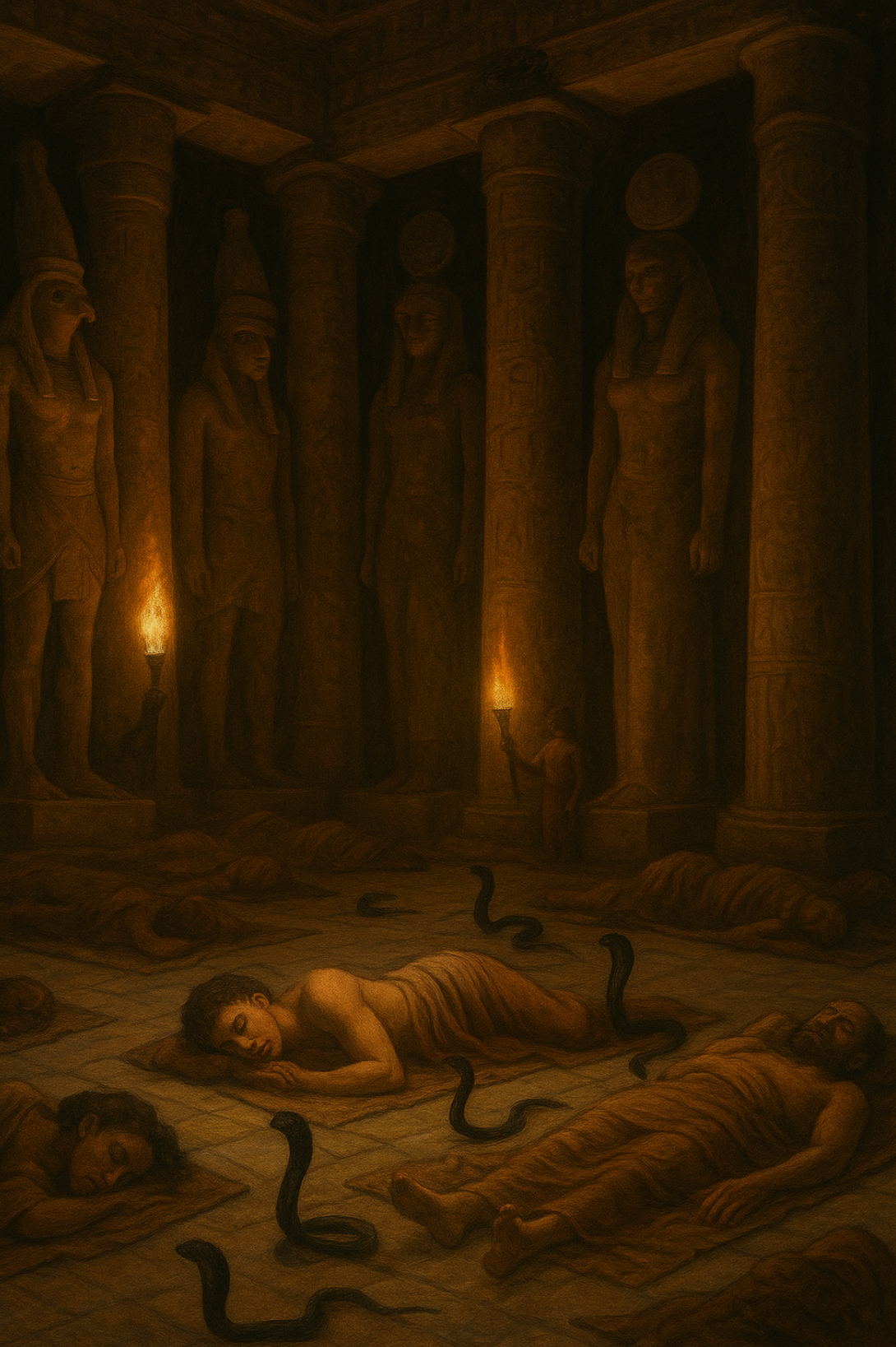 Imagine you are in an ancient Egyptian temple of dream incubation, lying on a hard floor on a thin mat at night, weary after your long pilgrimage to this sacred sanctuary. Massive statues of Horus, Osiris, Hathor, Sekmet, and other gods, lit by torchlight, look down at you from high above. Around you lie other supplicants for divine assistance. Black sacred cobras slither between your bodies.